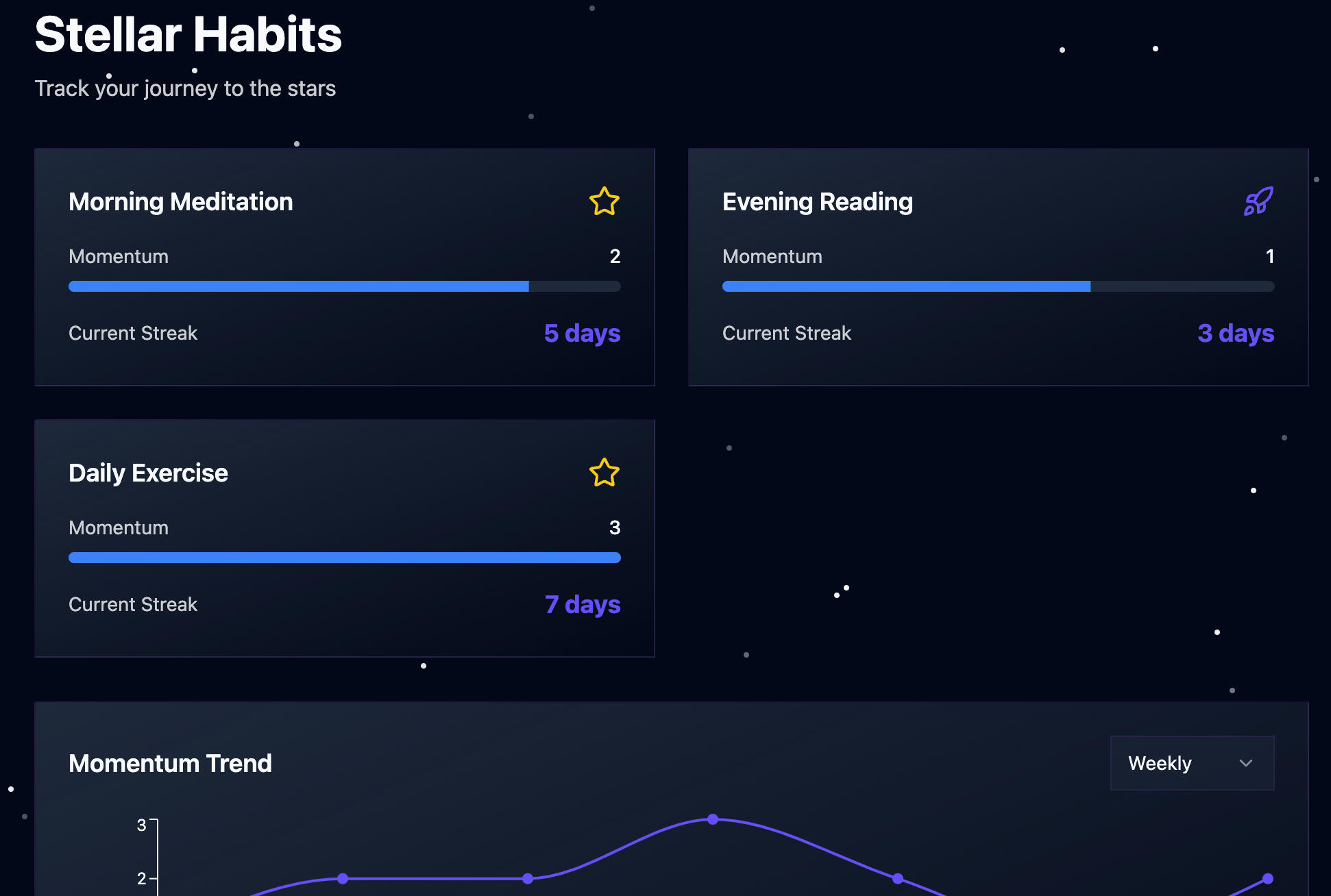 Tracking momentum with Stellar Habits offers a more realistic and forgiving approach to habit formation. We understand that life happens β a missed day doesn't mean starting over. youβre encouraged to bounce back, regain your momentum, and keep moving forward.